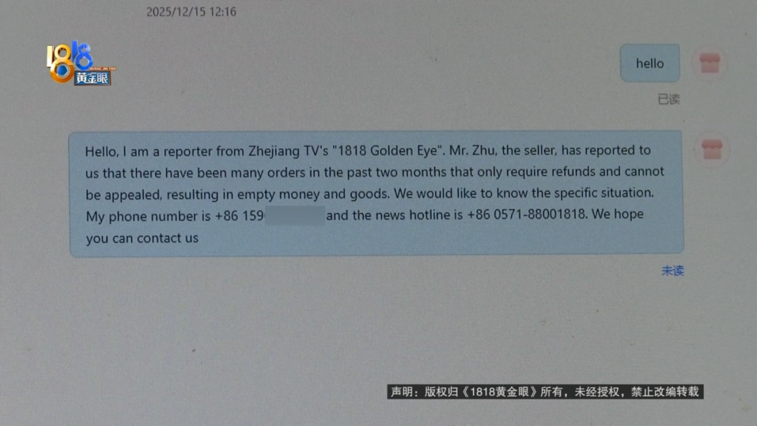 朱先生:被“零元购”了,这个团伙它在我店铺下了很多单,全部仅退款。平台也直接仅退款了,但是我没有任何操作权限拒绝仅退款。